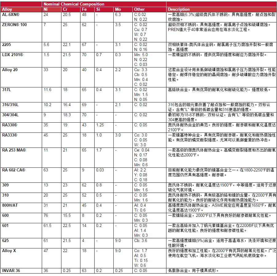 | 鍋爐 | 在電力鍋爐方面所選擇的材料應(yīng)該具有高度抗蠕變強(qiáng)度和在溫度上升氣氛中的耐熱性能。在氯,硫或者熔鹽的環(huán)境下,合金RA 253 MA, 309, 310, RA330和 601是不錯(cuò)的選擇。RA 253MA和309通常會(huì)被用作煤礦燒嘴,和其它電力鍋爐內(nèi)部零件,諸如管道支撐,管蓋和溫度測(cè)量計(jì)。因?yàn)镽A253MA在1600°F以上有兩倍于309和310不銹鋼的抗蠕變強(qiáng)度,并且在到2000°F仍有良好的耐氧化性能,故RA253MA也在很多CFB電力鍋爐上作為過(guò)濾器的材質(zhì)。RA330在2100°F以下具有耐氧化性能,在循環(huán)的熱環(huán)境中耐熱疲勞性能優(yōu)良,因此RA330可以作為制造煤煙風(fēng)箱的材料。 |